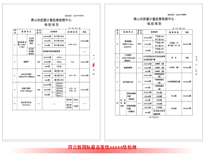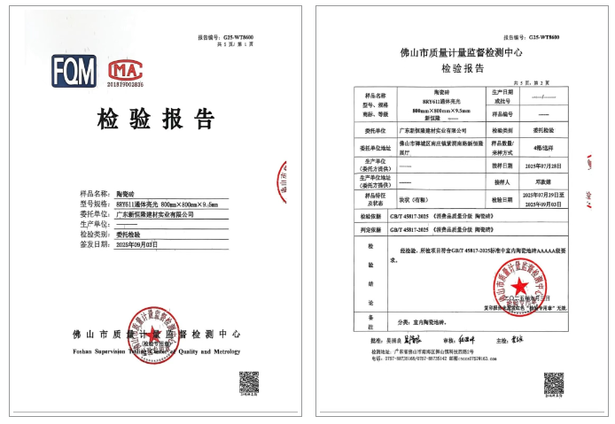 新恒隆集团以佛山制造底蕴为根基,以高标准智造优势为驱动,依托佛山现代化研发生产基地和数智化生产设备的强劲实力,整合了国内外尖端的智能生产设备和高端材料,严格执行远高于国家标准、佛山标准的企业标准附录A,此次送检产品是新恒隆集团800X800通体瓷砖,全面通过瓷砖静摩擦系数、辊棒印、表面平整度、耐磨性、耐污持久性等5A产品十大指标检测,展示出新恒隆集团双零瓷砖的性能出色、品质可靠。