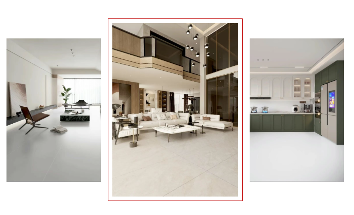创新应用金刚超平釉工艺,结合釉面与坯底双重加厚,窑炉横向出砖,实现超平如镜的极致平整效果,有效突破水波纹、R角、辊棒印等传统瑕疵,书写奢居范式。